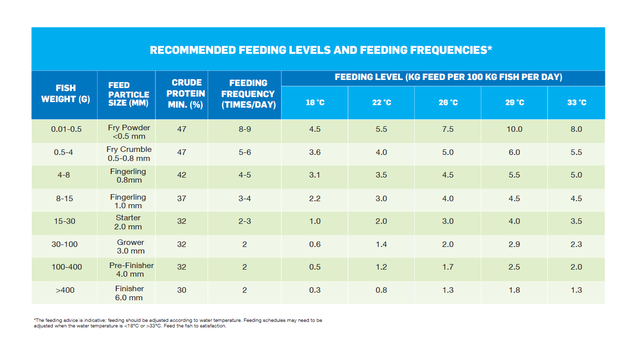 When fish are reared in ponds, cages, or any other aquaculture production system, they all require a feed assortment that is adapted to the various systems to ensure good growth and healthy fish. Feed assortments not only take into account healthy growth, but also water quality and other parameters which have direct effects on production performance.