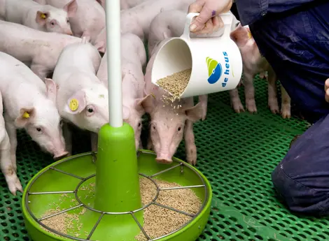 Feed intake also plays a very important role after weaning. The feed intake during the first two weeks after weaning determines for 70 percent the final rearing result and the quality of the piglets at delivery. If you make additional investments in labour and feed quality at this point in time, it will quickly pay off. During the suckling period piglets are accustomed to drink milk every hour. After weaning they therefore also eat a small amounts about twelve times a day. Light piglets consume more feed than heavy piglets during the first four days, after that heavy piglets eat more. The maintenance need of piglets immediately after weaning is approximately 150 g feed per day. On day three to four after weaning, all piglets must look nicely filled. To achieve this, the piglets must eat at least 0.5 kg of feed during the first three days after weaning. You can help the piglets to start eating early, often and in large quantities immediately after weaning.It is important that all piglets can eat at the same time. To accomplish this it is often necessary to put in additional round feed troughs in the first days after weaning. These must be filled at least three times per day. When the troughs are being filled, the piglets get up and start looking for feed. This is an additional stimulus to start eating. The effect of the round troughs is that the piglets becomes more uniform and that feed intake and growth can increase by 40 percent.