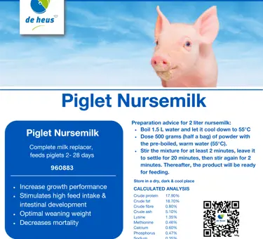 De Heus Nurse Meal is developed to fully replace sows milk in case the sow is not able to nurse or for additional feed to support growth and decrease mortality. The milk consists of high-quality, easily digestible ingredients that ensure a healthy start for your piglets. The high palatability ensures high intake and increases piglet weight very effectively.